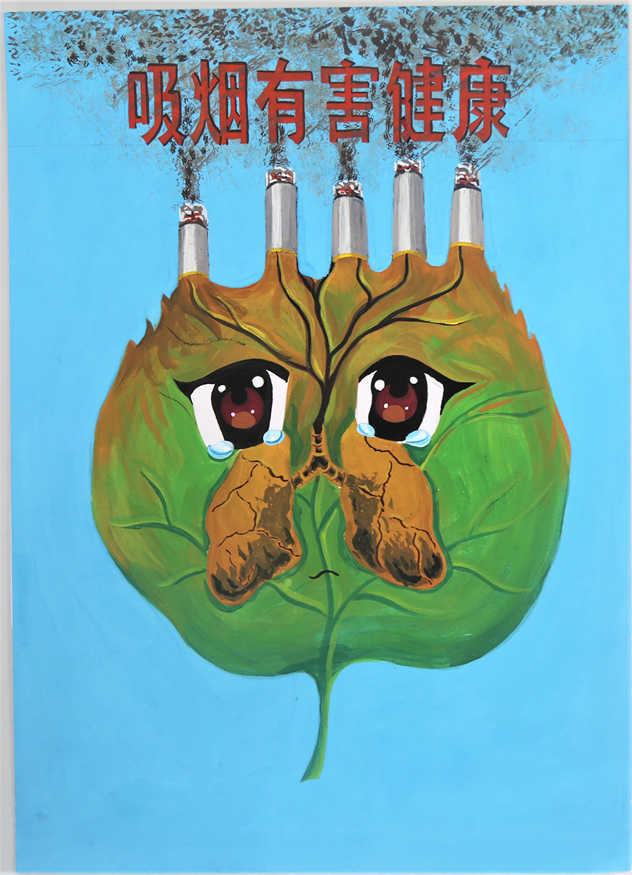 健康,随烟而逝;病痛,伴烟而生。作品中的绿叶代表地球上生机勃勃的绿色环境,还寓含了人类活力健康的肺。但这一切在香烟的蒙蒙烟雾中全部变了样:绿叶渐渐枯萎,肺也变得焦黑,这绿叶上的一双大眼也流下了悔恨的泪水……作品用醒目的泪眼、失去生机的绿叶和焦黑的肺,警示人们:吸烟有害健康!