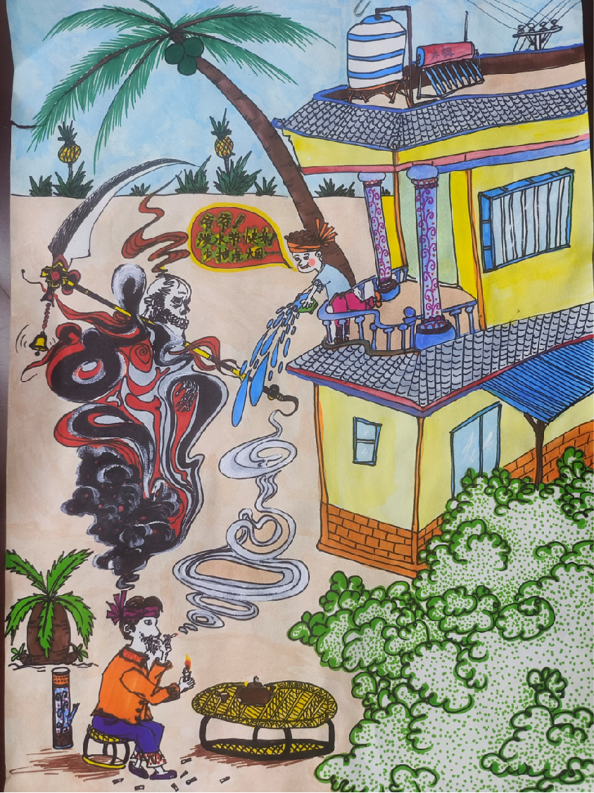 吸烟危害人体健康,借着“泼水节”节日的氛围和爷爷开了一个小小的玩笑,爷爷他并没有骂我,反而我俩都哄堂大笑。