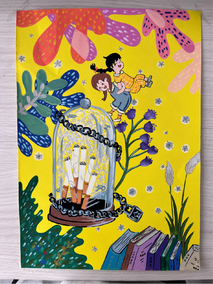 将烟都收集起来,封锁在玻璃罩中,给人们以警示。还给人们清新的环境,不再因为吸烟而影响健康,不再受二手烟的危害,让孩子们健康快乐的成长。