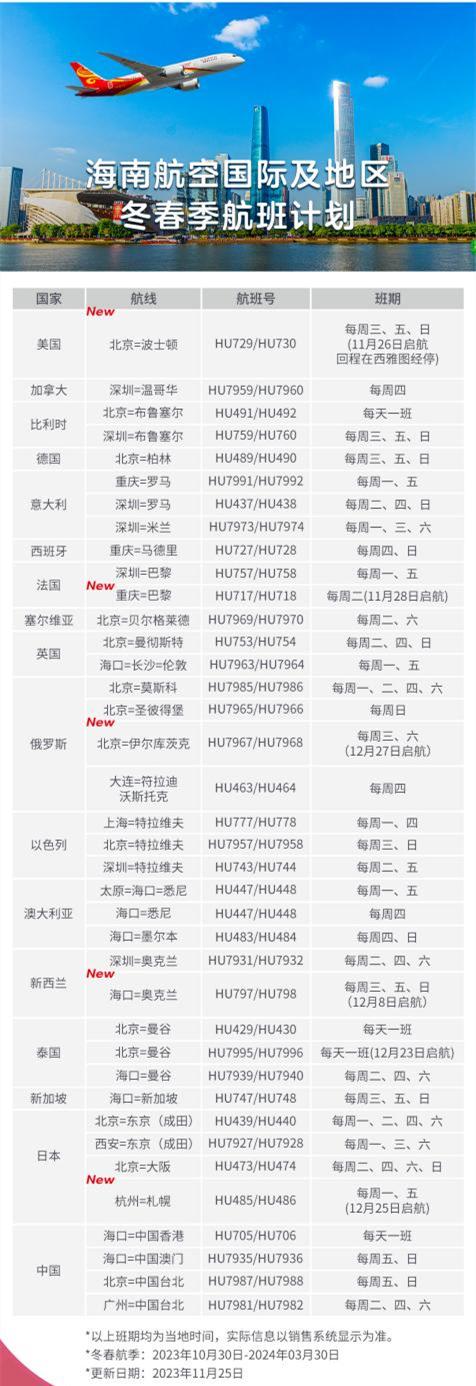 截至目前,海南航空已恢复、新开运营北京、深圳、上海、海口、重庆、西安、长沙、太原、大连、广州等10个城市出港的30余条国际及地区往返客运航线。后续,海南航空将继续加快国际及地区航班的复航及开航工作,以满足全球旅客的出行需求。