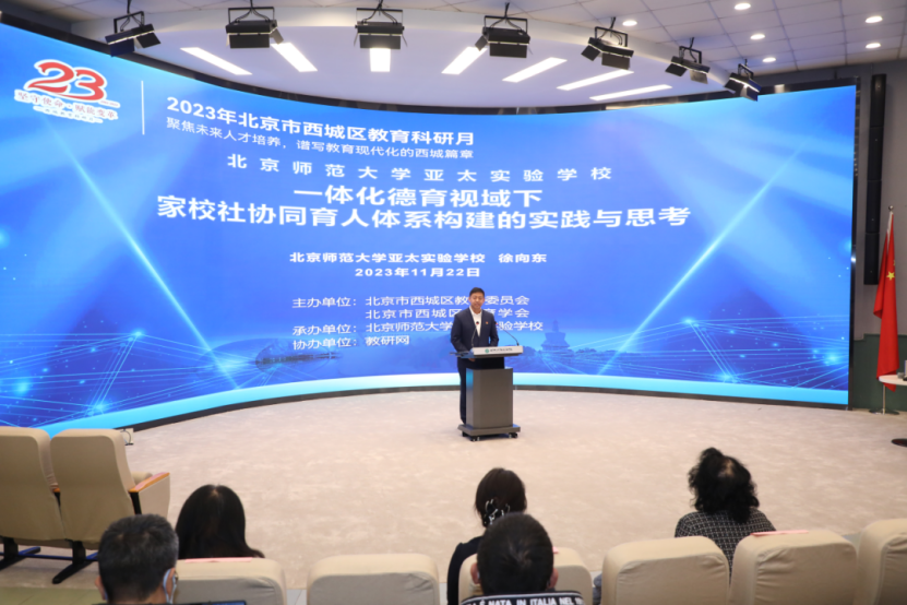 2023年11月22日,由北京市西城区教育委员会、北京市西城区教育学会主办,教研网协办的“一体化德育视域下家校社协同育人体系构建的实践与思考”科研月现场会在北京师范大学亚太实验学校召开。