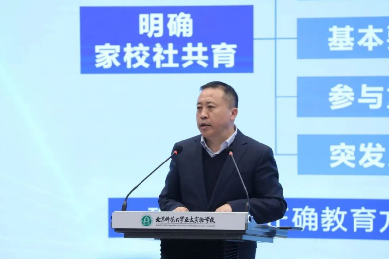 学科课堂观摩及主题班会观摩结束后,北京师范大学亚太实验学校徐向东校长做了《一体化德育视域下家校社协同育人体系构建的实践与思考》的主题报告。徐校长在报告中完整全面地阐述了学校探索共育一体化过程中的困惑和突破点。他介绍,亚太实验学校在曾经已有的基础上不断融合创新,在不同的学段尝试不同的家校社共育途径,并形成了具有亚太特色的家校社共育协同机制,取得众多阶段性的成果。“家校社育人协同育人的新格局,真正实现学生‘走出’学校,家长、社区‘迈进’学校,多边、跨界,共负育人成才的责任使命。”徐校长表达了只有家校社协同共育、通力合作,才能在符合时代发展的需求下创建学生成人成才的健康环境,为学生的成长努力营造更和谐的家庭、更开放的学校和更包容的社会。