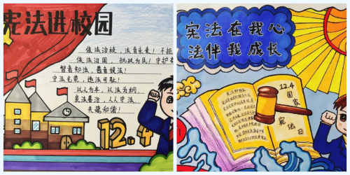 美术老师利用绘画课,指导学生画出一幅幅精美的法治手抄报,不仅把所学的宪法知识融入了他们的作品中,也把自己对宪法的认识表现在手抄报中,他们用自己的方式宣传宪法内容,诠释着守法的意义。