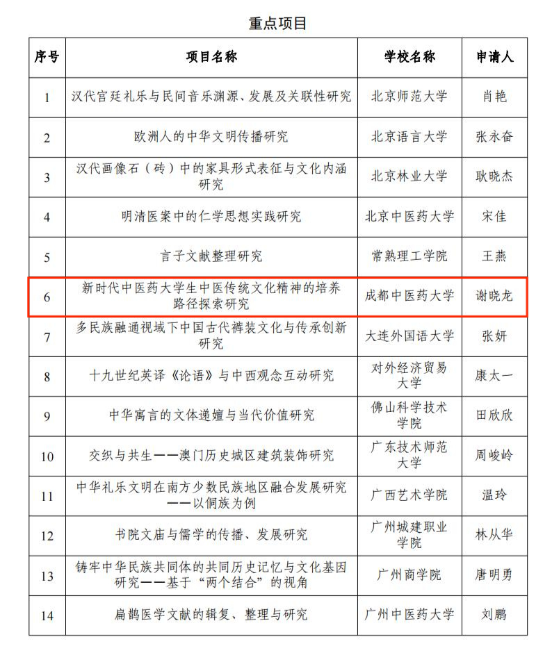 教育部社科司关于“中华优秀传统文化专项课题(A类)”评审结果日前发布,成都中医药大学附属眉山医院/眉山市中医医院谢晓龙教授“新时代中医药大学生中医传统文化精神的培养路径探索研究”的项目通过教育部社科司关于“中华优秀传统文化专项课题(A类)”评审!