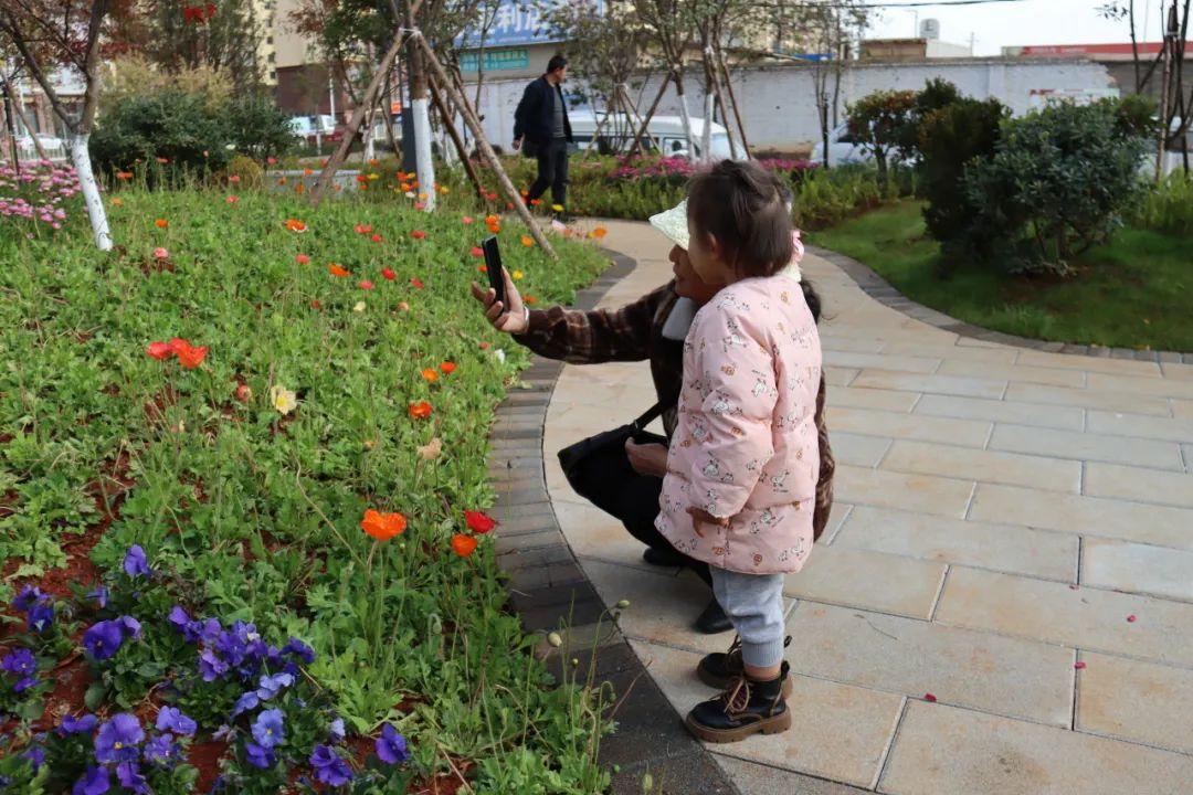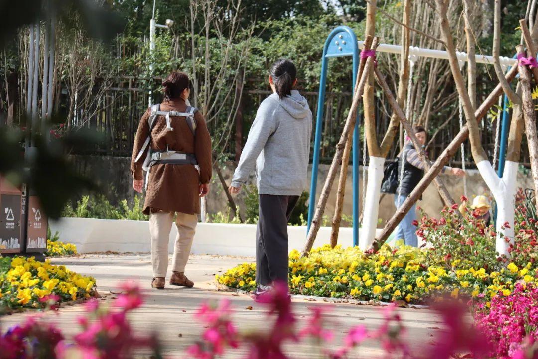 拥有2600多平方米的闲趣小游园栽种着多类花卉,三色堇、银叶菊、紫罗兰、虞美人、虾皮花等;小假山、健身运动器械等设施让小游园更具趣味,也吸引了不少来此拍照打卡的游人。