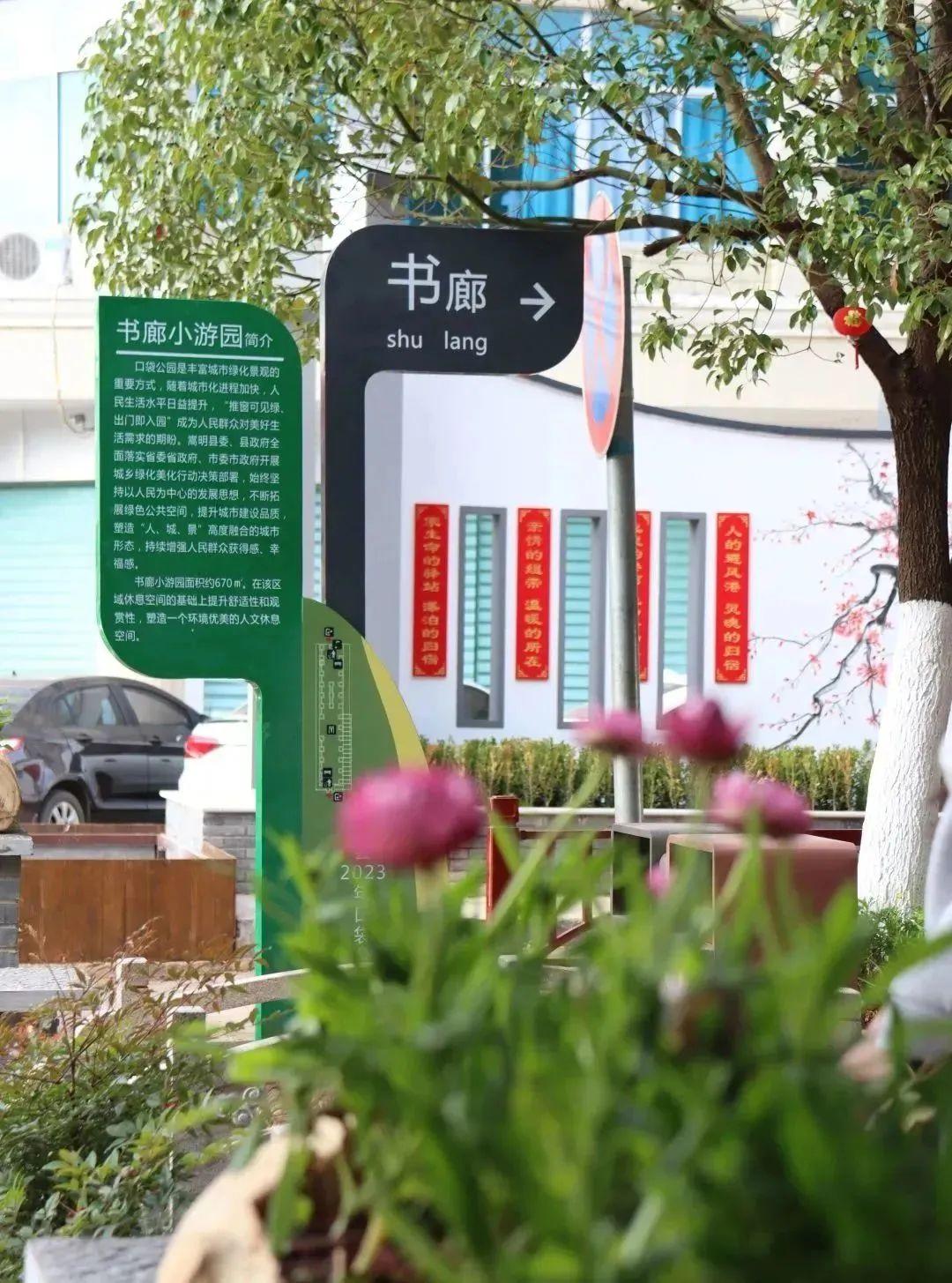 以书廊、文歇、静园、邻里、悠径、赏秋、本草等颇有意境诗意名字命名的14个小游园,星罗棋布、或密或疏分布在县城各街角,从黄龙街、玉明路两条街辐射开来,在人口聚集的居住区周围、城区边缘都兼顾规划建设。