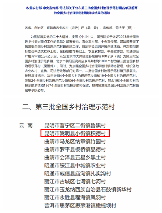 近日,云南省嵩明县小街镇积德村获评“第三批全国乡村治理示范村”,再提一块国家级“金招牌”。