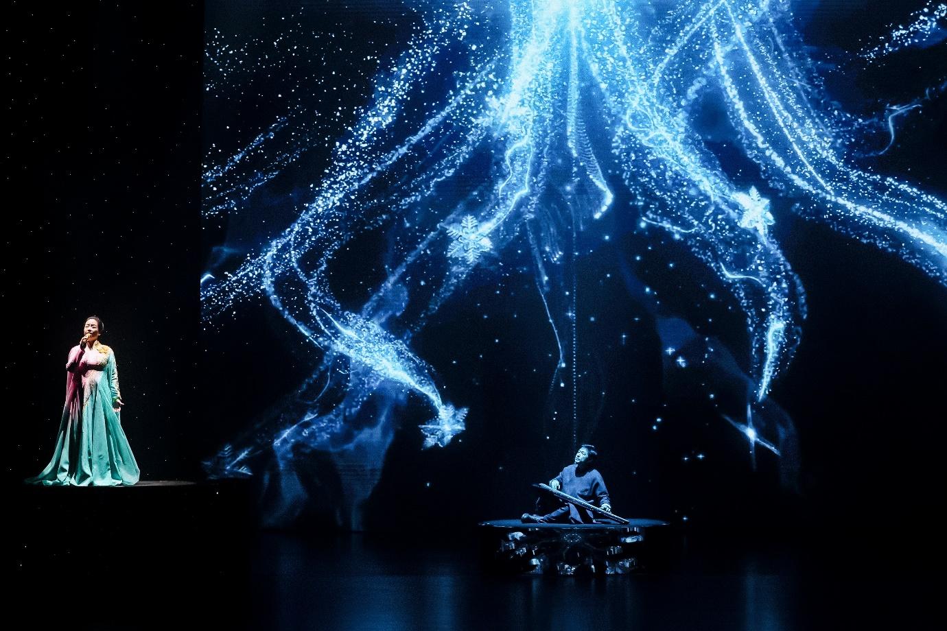 如何让观众充分理解“寻剑音声海”的文化概念是对主创团队的首要考验,也是团队灵感创新的核心爆发点。通过水墨电影先导片铺设剧情,解读“寻剑”之意,是音乐会开篇亮相的第一个创新点。以逆境中奇遇知音、蜕变成长,并穿越妙音、终得音声海智慧之剑的故事为缘起,通过故事性的影片传递“寻剑”含义,全面系统的完成了概念传递。创新性的进行《音声海》即兴演奏,通过宇宙星空的天籁之音、深海巨鲸的生命之音、大千世界的自然之音三个篇章,引发观众对天际、对深海、对自然的声音感悟,也让观众对音乐疗愈也有了直观、深刻的体会。