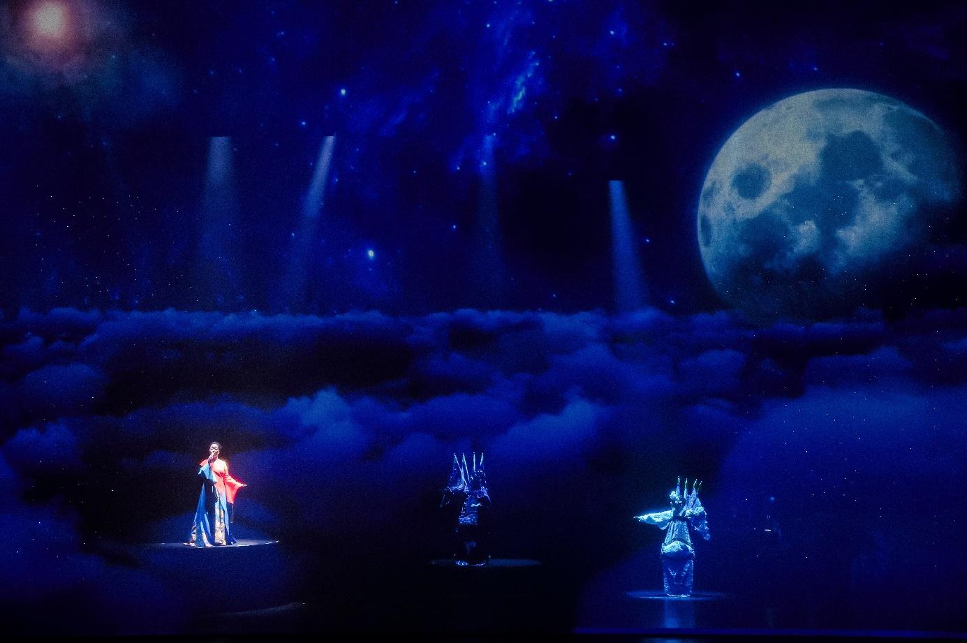 值得一提的是,音乐会采用现场演奏伴奏,在乐队配置上将吉他、键盘、贝斯、打击乐等现代乐器与琴、箫、琵琶等民乐乐器融合编排,既有韵律深远的传统曲调,也有铿锵有力的现代节奏,赋予了传统文化全新的演绎效果。舞美设计蕴涵“天一圆、地一相”的概念,以“日月同辉”的舞台造型,借助幕帘和LED屏幕打造裸眼3D的视觉效果,形成人在画中的沉浸式幻境,借助动态视频的视觉冲击力、灯光效果的氛围渲染力,让观众随着小珠悟义的唱诵,穿梭在不同的曲调意境之中。