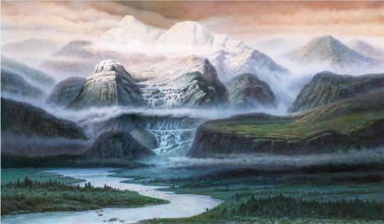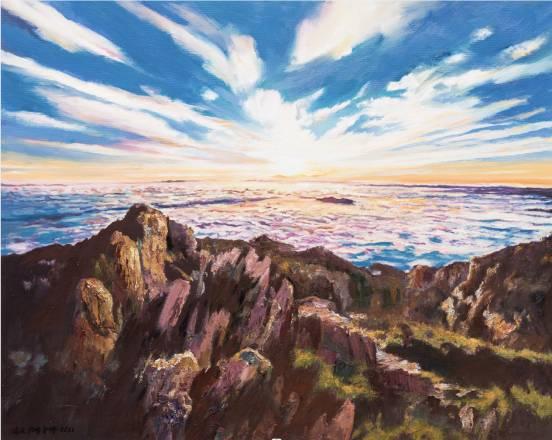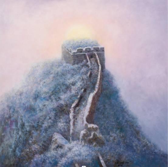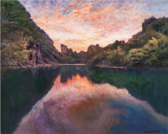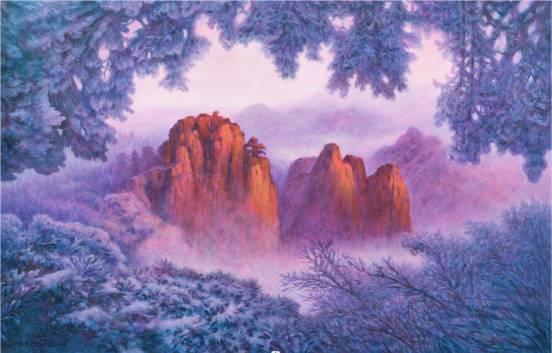2018年是冯庆艺术人生的一个分水岭。这一年,他跳脱开北方的冰雪,开始醉心于全新绘画题材的创作。泰山之雄,峨眉之秀,黄山云海,三峡激流,瀚海波涛,令人神往的祖国大美山河,在作品中被一一展示、表现。他用或凝重或明快或清秀的色彩渲染出“心源”中的山水。这一时期的作品纯净、梦幻、唯美,犹如童话世界,精雕细琢,造型完美,色彩斑斓,自然物象与主观情思物我交融,有情感,有温度,充满东方意象之美。