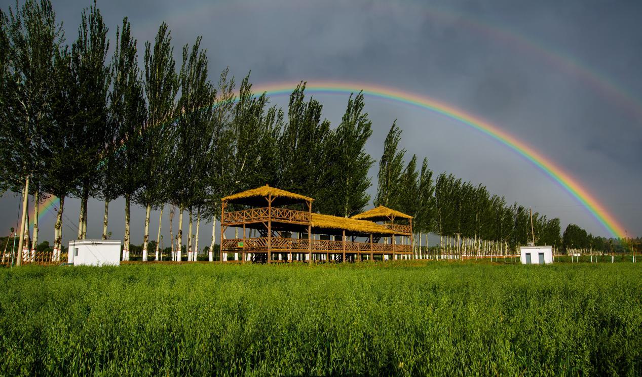 秋冬时节,站在榆林市榆阳区金鸡滩镇白舍牛滩村田园综合体高20米的观景台上,只见阳光下,一片片波光闪烁的草滩湿地、一个个瓜果飘香的蔬菜大棚、一排排漂亮精致的别墅洋房、一座座整洁干净的矿区厂房、一行行挺拔高耸的路边白杨……恰似一幅新时代陕北版的“富春山居图”。