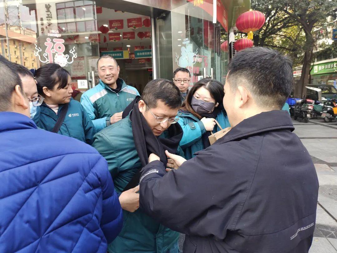 日前,成都市锦江区总工会“锦基金锦工驿心”慰问新就业形态劳动者暨冬季送温暖活动持续进行中,区总工会党组成员、挂职副主席陈小勇带队慰问了锦江区辖区内的快递员们,为他们送上定制的冬日暖心围巾,让他们感受到党和政府以及工会组织的关心关爱。