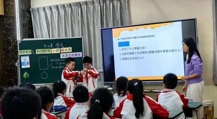 四年级的汤慧老师借助多媒体、实物等让学生初步感知周长;采用提问、讨论等方式引导学生感知周长的内涵;以测量树叶的周长为核心任务,让学生在活动中,理解周长的本质,并感悟“化曲为直”的数学思想方法。在有梯度的互动练习中,拓展学生逻辑思维,激发他们的主动性和创造力。