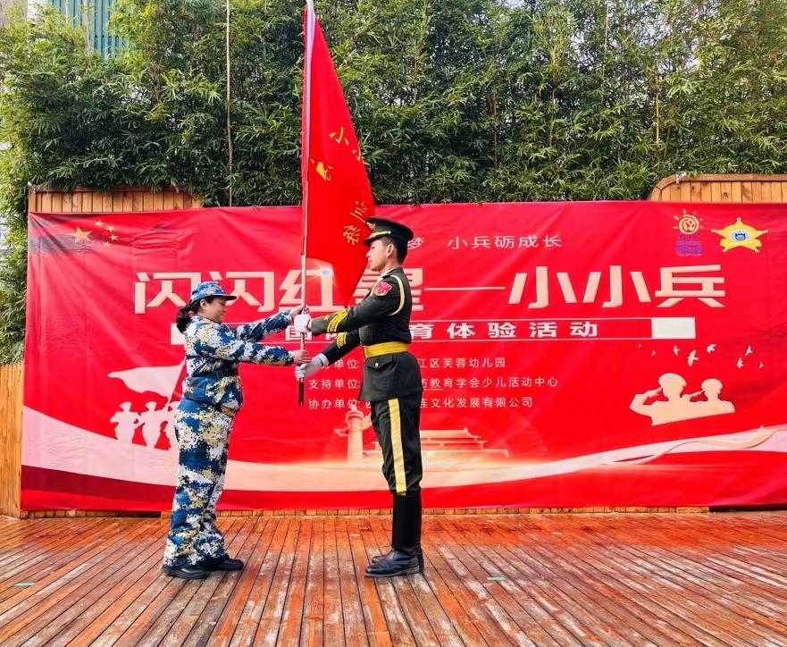 迎着朝阳,成都市国防教育学会少儿国防教育中心的教官们向园长授营旗,向小兵授班旗。接过火红的旗帜,小兵们坚定的眼神和挺拔的身姿,传递出对军人的敬佩,表达出将在练习中不怕苦、不退缩、坚持不懈的决心。