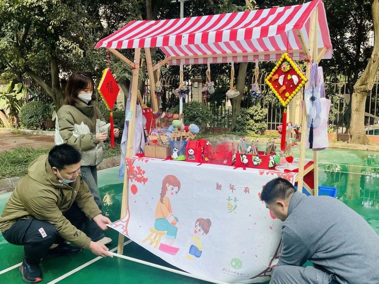 同时,家长们在得知孩子们的想法之后也积极加入了进来。幼儿园和家庭分工合作,孩子们在老师的帮助下制作文创作品,在手工创作中感受劳动的美好,也展现着自己热爱生活的态度。家长们布置展架,共同完成幼儿园定制的文创摊位。