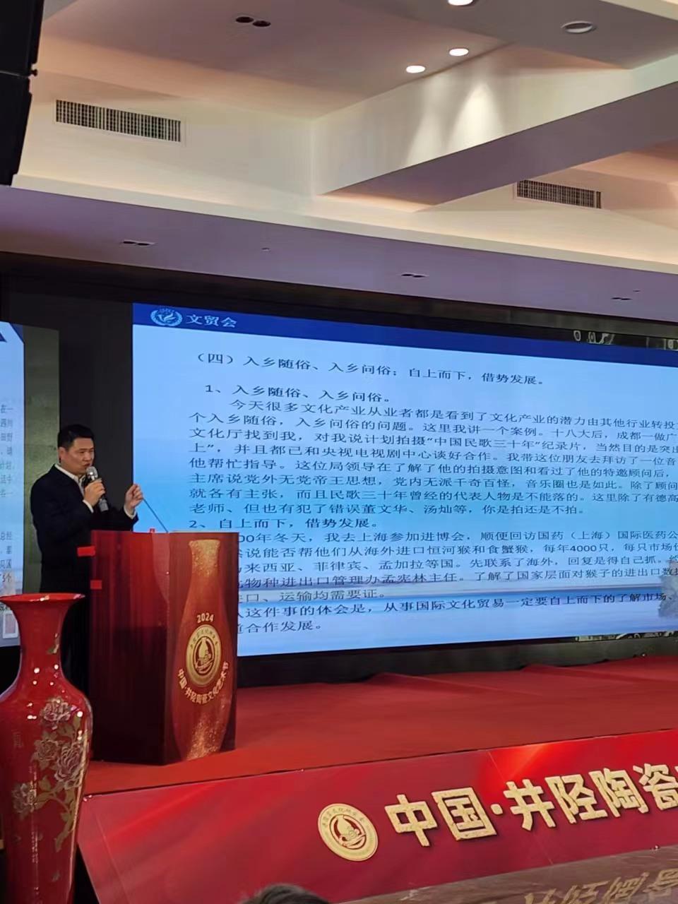 对外文化贸易作为文化强国建设的重要内容,对提高国家文化软实力和增强文化国际传播效能具有重要意义。近年来,我国对外文化贸易发展成效显著,这与各级政府部门大力支持密切相关。本次艺术节组委会专门邀请北京国际文化贸易促进会会长宋春峰以文化贸易出海为主题作主旨演讲,用实际真实的贸易案例阐述文化贸易出口的商业经验,吸引了在场嘉宾的深切关注;他认为陶瓷文创产品开发不只是追求工艺,更应该着眼于市场客户群体的定位和历史元素挖掘提炼,这样才能突出井陉窑文化产品的差异化,更好的走向国际市场。