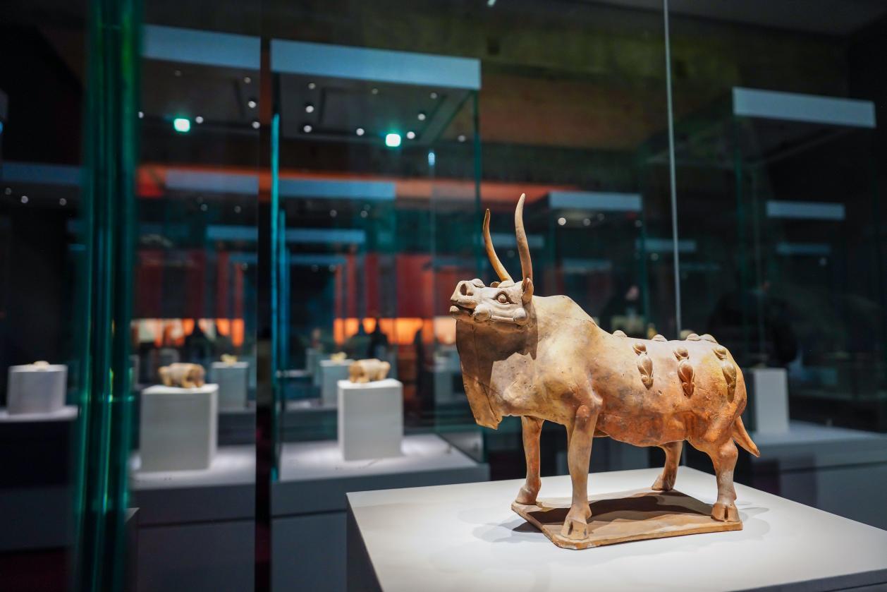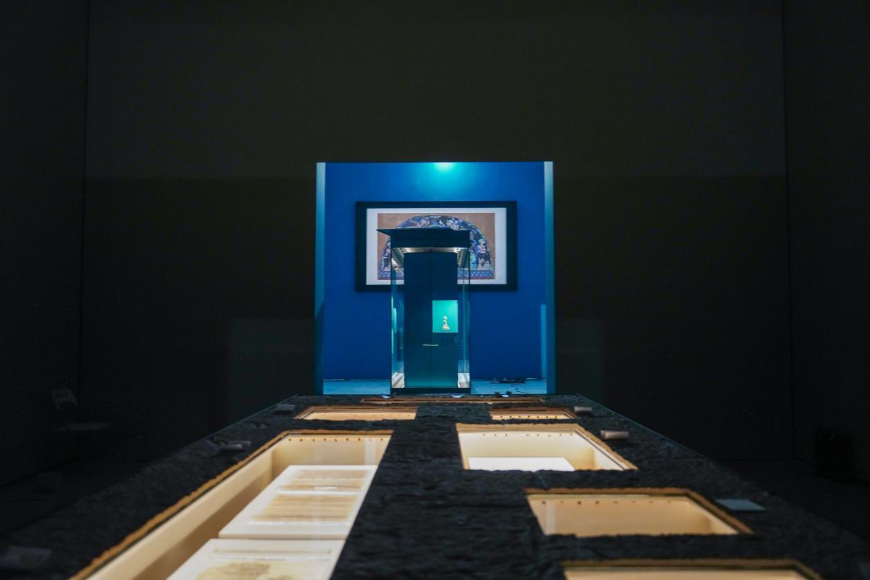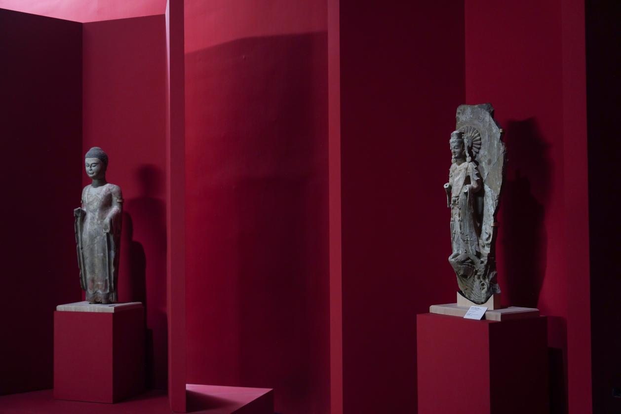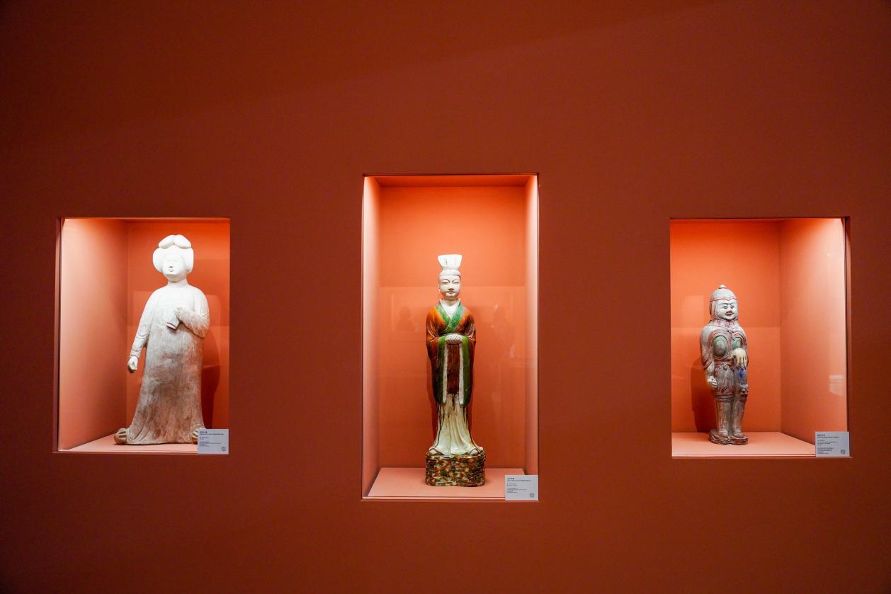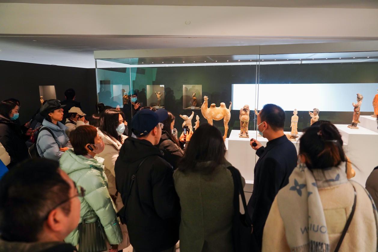 “驼铃声响——丝绸之路艺术大展”从艺术的视角,通过绘画、雕塑、造像、器物等实物,并辅以声音、影像、多媒体等,多个角度来立体呈现丝路艺术的活力。展览大胆创新融入当代视角,使得现当代艺术与古代文物瑰宝同场相邻、传承与创新时空并存,让观众置身于以往完全不同的“丝路时空”,从而感受文明交融与历史演进的震撼之美,透过文物与当下的艺术创造,让人感受到历史的深处以及文化传承与创新的意义所在。为更多关注者呈上艺术机构视角的“何以丝绸之路”的时代答案,全新开启丝路叙事方式和观看方式。展览名作荟萃,距今约4000年的新疆小河墓地毡帽质朴神秘;战国至南北朝时期的黄金面具镶嵌着奢华的红宝石;龙门石窟擂鼓台南洞初唐“宝冠佛”重达7吨,宏雄壮丽;龙门看经寺浮雕罗汉像不仅被收入美术史教科书,被盗海外终回归的经历更是充满传奇;赶路的干饭人胡人吃饼骑驼俑描述着千年前生意人的生活艰辛;唐代的小学生一边抄写《论语》,一边请求先生早放学,回家是孩子最真切的期盼……众星荟萃为公众制造出跨越时空的艺术场域。“丝绸之路”是贸易之路,更是艺术之路,文明之路。马蹄阵阵,驼铃声响,东来西往中多种文化、文明在丝绸之路碰撞,“艺术”以多种方式在丝路沿途传播,生长演变。造像、壁画、书法等这些我们今天视为艺术的载体,最初有着信仰传播、寺院或丧葬装饰、法律文书等功用。历经千年雨打风吹,它们的现实功能如今不复存在,留下形式之美,以文物与艺术之名供后人叹赏。