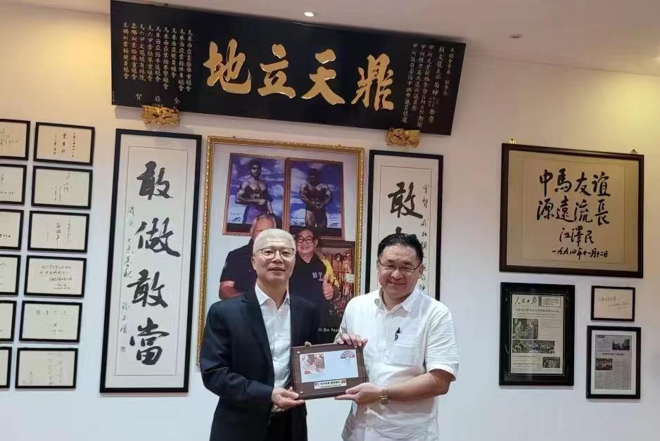 马来西亚中国公共关系协会副会长、拿督威拉颜天禄为厦门市闽南文化研究会会长叶细致赠送纪念品。(孟江波/摄)