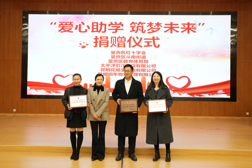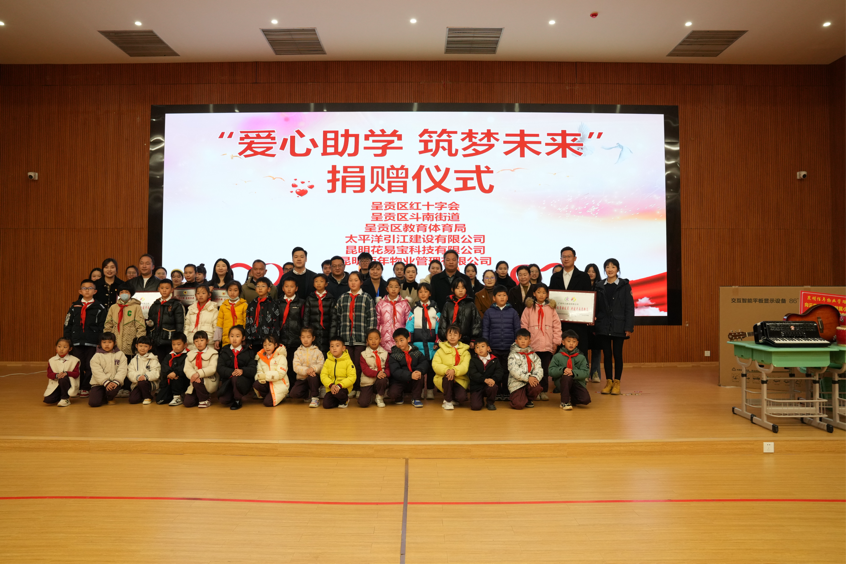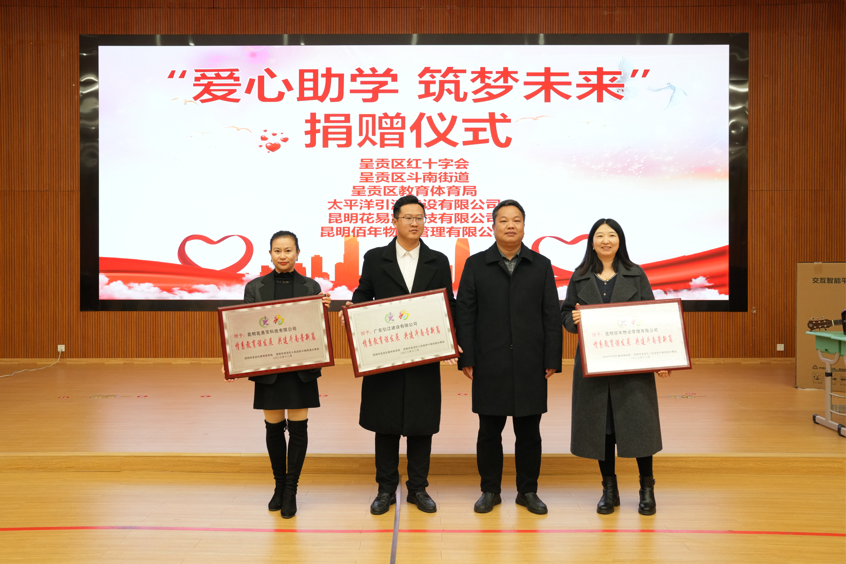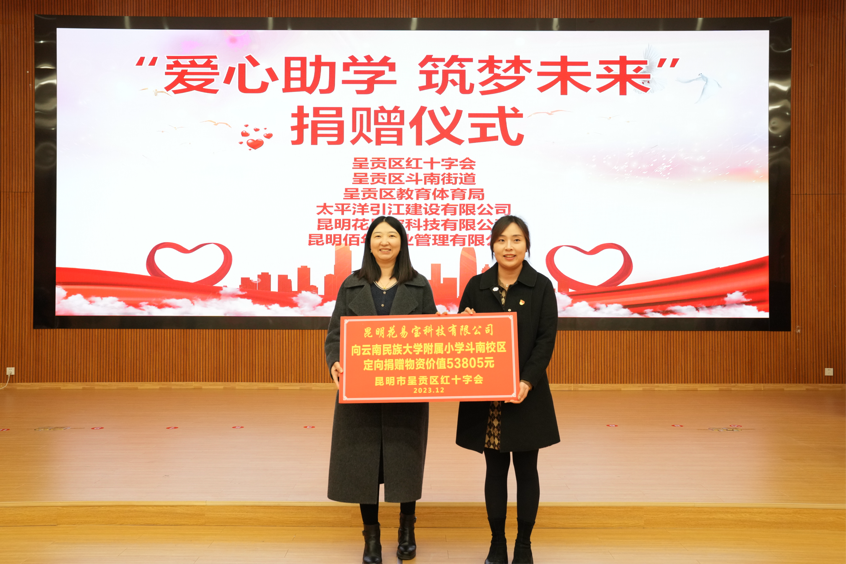 1月17日,呈贡区红十字会、斗南街道携手爱心企业助学捐赠仪式在云南民族大学附属小学斗南校区举行。呈贡区政府副区长、区红十字会会长龙晶晶,区红十字会、区教体局、斗南街道相关负责人,民大附小教育集团主要负责人、学校全体教职工、家长及学生代表参加爱心捐赠仪式。