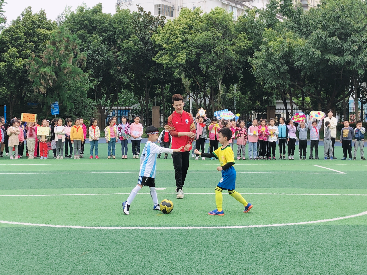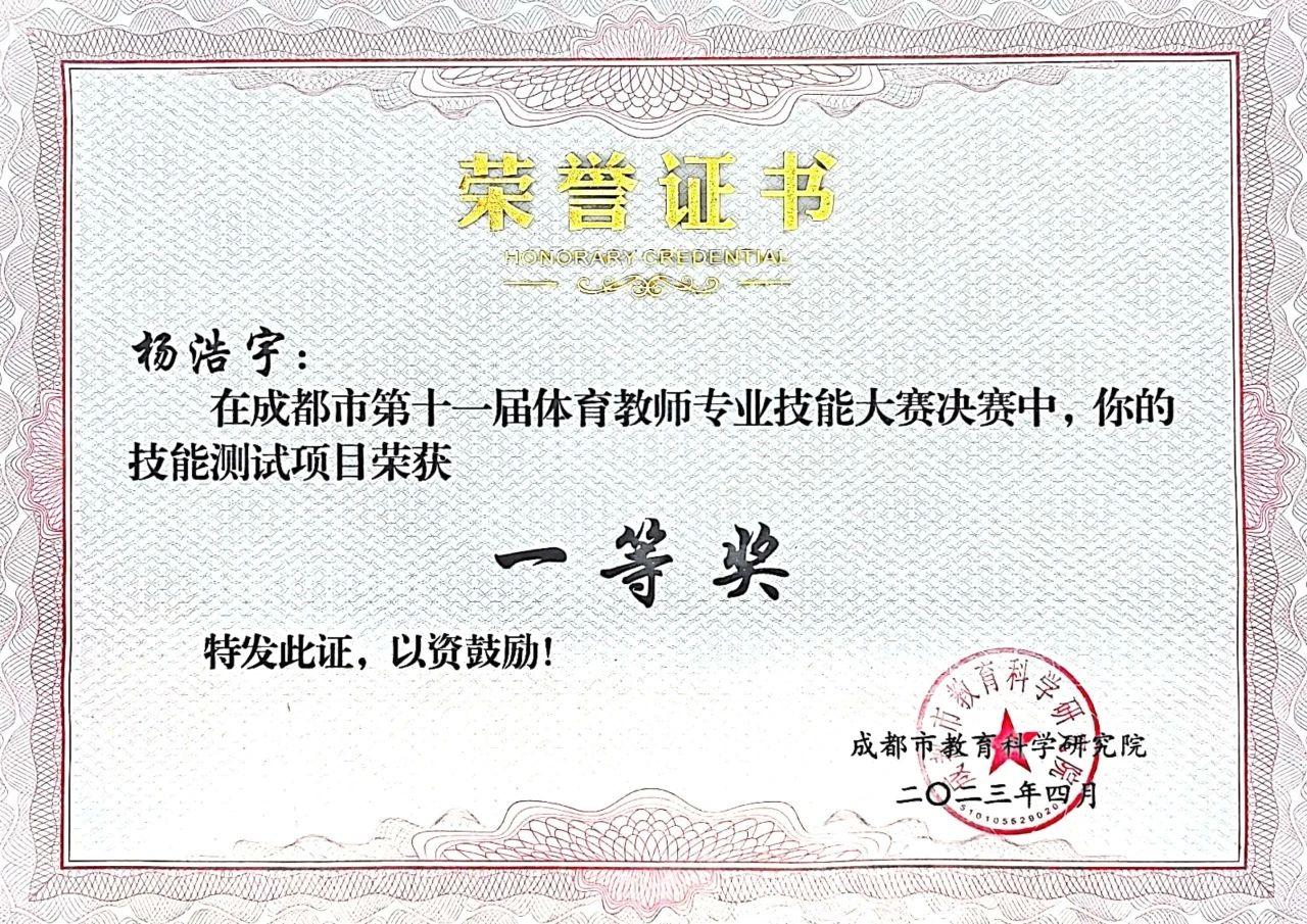 杨浩宇负责的学生足球运动项目成绩也有巨大突破,学校男子足球队首次升级到成都市青少年T甲(U9)联赛,并且在“锦江杯”足球赛(3-4年级)中首次闯进八强,荣获一等奖。