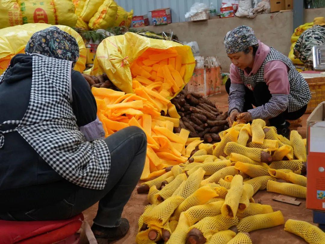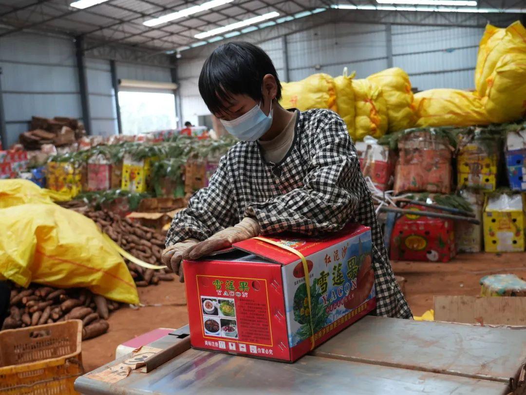 产业发展搭快车,乡村振兴再提速。春节前夕,云南省嵩明县牛栏江镇花窝村雪莲果仓储中心一批批挑选出的雪莲果,打包装箱,准备“搭车”运往全国各地。