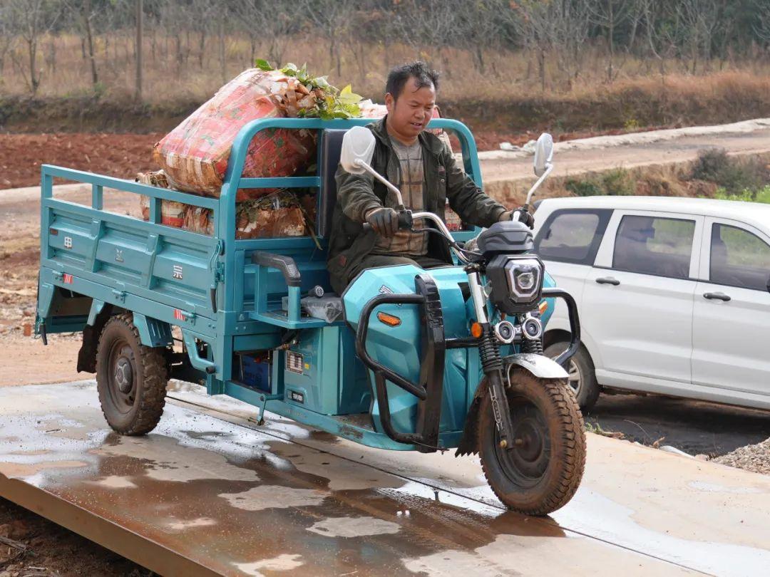 在仓储中心门口,村民用货运三轮车载着采挖好的雪莲果来到地磅称上称重,工作人员通过电子称重屏上的显示数字,对过磅的雪莲果做好重量记录,算好价格。