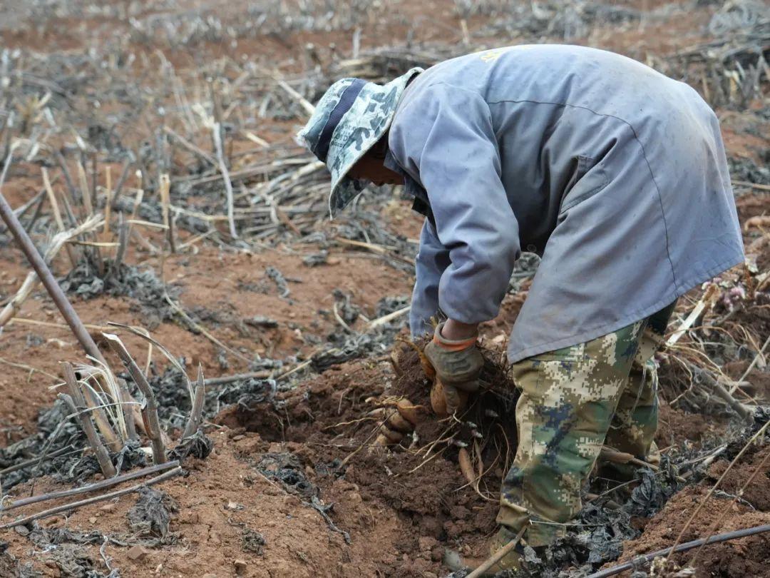 记者来到雪莲果种植基地,部分村民正在忙不停歇地采收雪莲果。采收过程中,村民们对挖出的雪莲果大小进行初次分拣,果型饱满的大果成了“重点保护对象”。在采收过程中,村民们会在采收的雪莲果框上覆盖一些叶子。有经验的种植户解释,这些叶子是为了保证雪莲果的水分不会流失。由于去年天气干旱,土壤水分不足,虽然部分种植户采取了盖膜种植的方式以保存土壤水分,但今年的雪莲果产量还是有所下降。