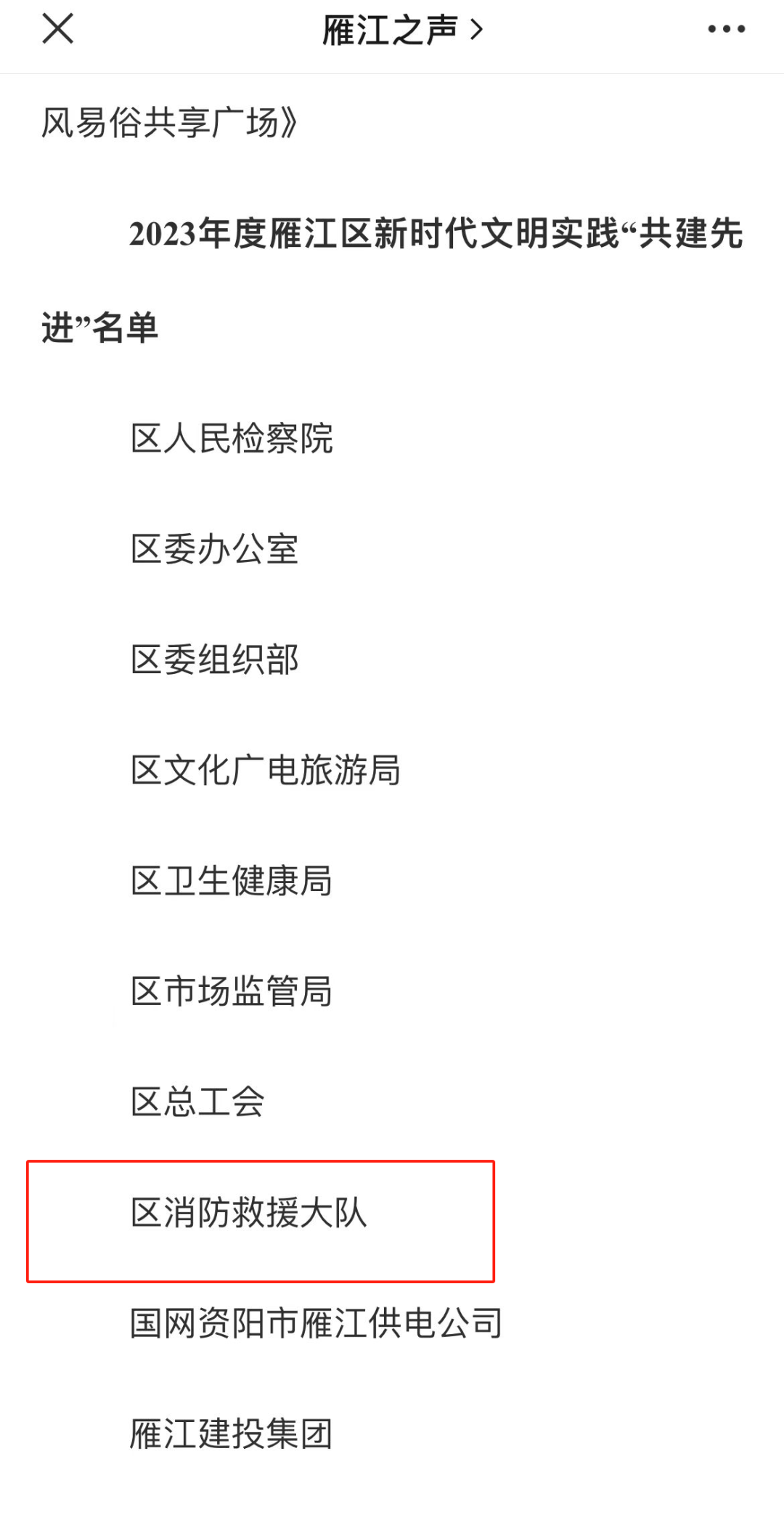 近日,中共资阳市雁江区委宣传部、资阳市雁江区精神文明建设办公室通报了2023年度资阳市雁江区新时代文明实践 “示范站点”“优秀案例”“共建先进”“优秀文明实践专管员”“文明实践标兵”的评选,雁江区消防救援大队在全区43个部门中脱颖而出,荣获新时代文明实践“共建先进”集体。
