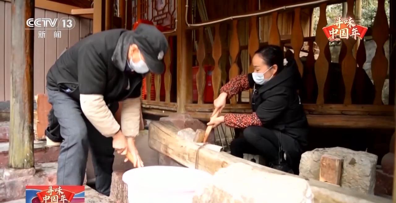 在湖北恩施建始县,一到过年,家家户户就开始打糍粑。当地制作糍粑的方式叫“脚踩舂碓”,一头扶着栏杆踩着碓头碾压捣碎米粒,一头翻动着碓窝里的米团,一翻一锤将糯米捶打成团。