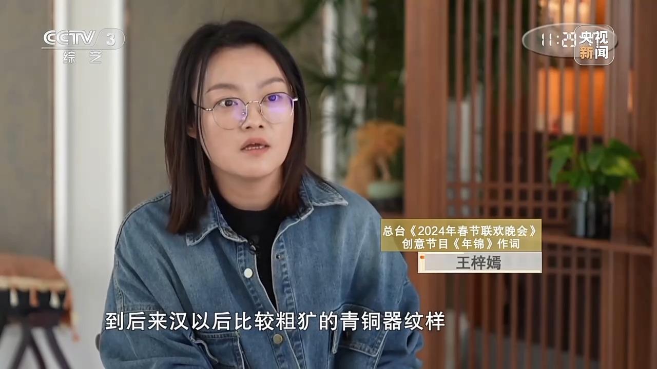 总台《2024年春节联欢晚会》创意节目《年锦》作词 王梓嫣:我们在创作的时候需要做大量的背景调研,从最开始原始社会时期的几何纹样,到后来汉以后比较粗犷的青铜器纹样,再到汉唐以后的花鸟鱼虫……不同的时期,映射出来的是当时人们的愿景。中国人特别喜欢借物言情,我们通过这些纹样,其实可以看到很多影子。我们选择的标准,就是不同朝代有不同气质。汉代是贴近自然,唐代是百兽云集,宋代是百花齐放,明代是五谷丰登,我们希望能够让人看到,几千年以来纹样的变迁。但是中国人对于大千世界的热爱,和对美好生活的祈愿,是一直没有变的。
