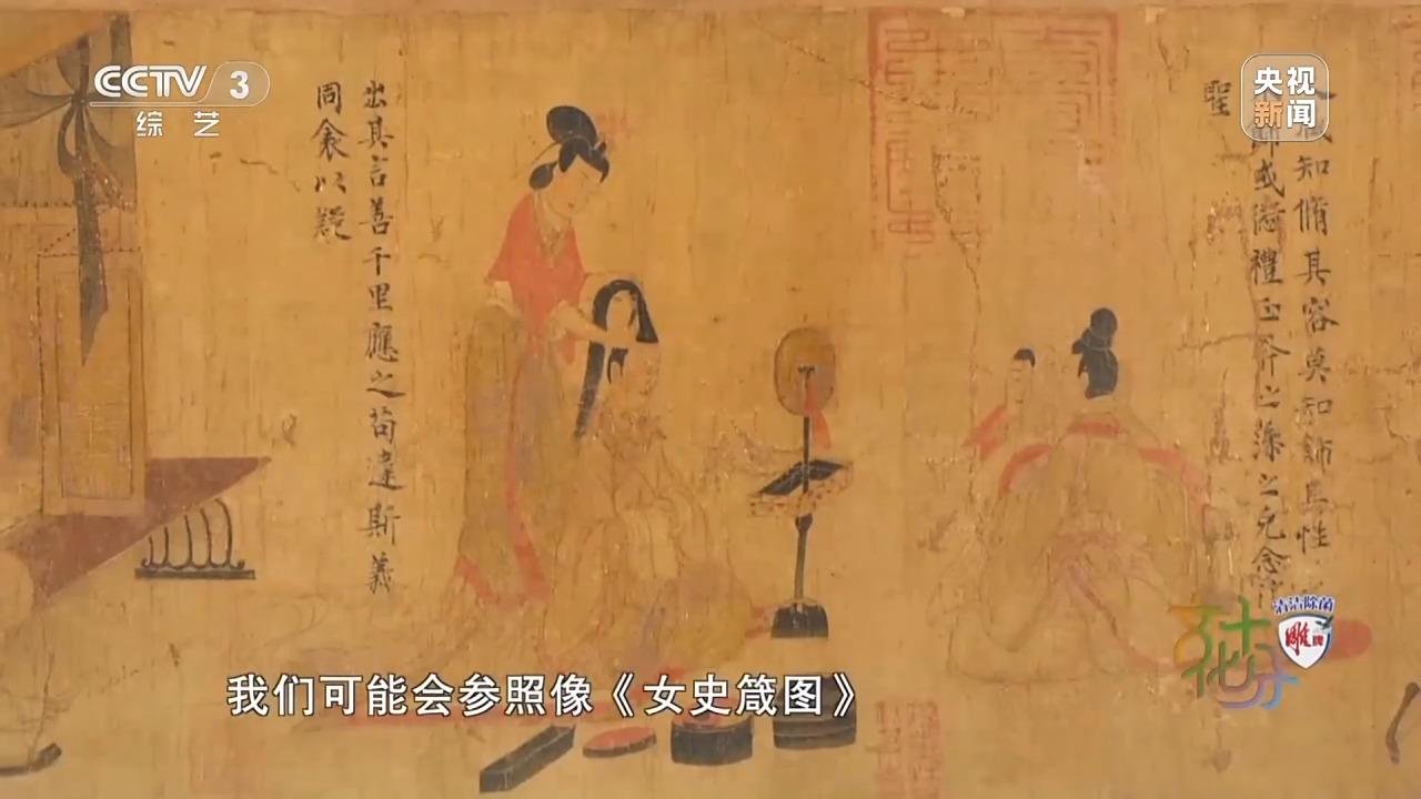中华服饰文化研究会理事 衣冠复原团队创始人 陈诗宇:在发型上我们尽量参照传统绘画,包括考古成果里体现的一些造型上的依据,比如汉代的发型,我们可能会参照一下《女史箴图》《烈女仁智图》,里面体现东汉后期的女性的发髻,唐代发髻来自敦煌壁画里晚唐供养人的发型。