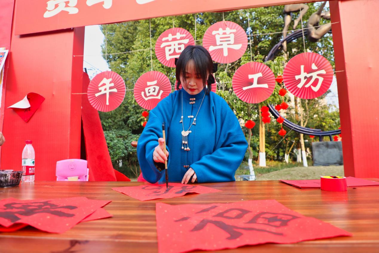春联、剪纸、年画的摊位旁人头攒动,此次活动邀请了美术协会老师和书法老师组成茜草书画手工坊,除了在现场创作、展示一批精品书法年画,还在老师们的指导下提供材料让群众现场学习。旱地划龙舟、打糍粑、赶鸡入笼等传统民俗运动组成了茜草年味中最热闹的部分,活动在这春日的阳光中倍显喜庆,不同的队伍在这特别的日子里真正把欢乐和友谊放在了第一位,居民们“雄起!”“加油!”的声音也为全场队员响起,茜草街道党工委书记甘霖也满面笑容地参与到了赶鸡入笼中来,为居民和茜草发展带来更多吉祥。