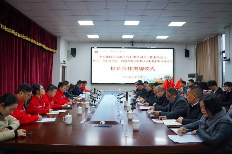 2024年2月22日,四川三河职业学院与中石化西南石油工程有限公司井下作业分公司、四川吉瑞祥能源技术服务有限责任公司“产教融合、校企合作”揭牌仪式在学校二会议室顺利举行。学校执行理事王文潇、党委书记叶昌伦、专家杨宗伟、常务副校长卢喜宏、副校长蒲先祥,中石化西南石油工程有限公司井下作业分公司党委书记、副经理安华龙,党委组织部(人力资源部)主任张颖、修井队队长万力、党委组织部(人力资源部)高级主管黄涛、四川吉瑞祥能源技术服务有限责任公司总经理呼春燕等领导共同出席此次揭牌仪式。
