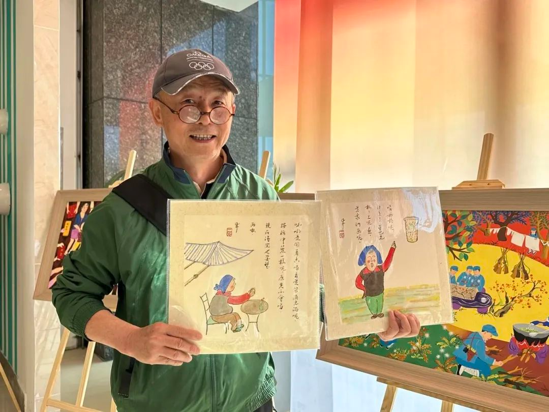 当天,来参观画展的张爷爷很受触动,即兴创作了老太太喝咖啡等两幅漫画并感慨地说:“感觉这些民间绘画相当不错,有很多很现代的表现手法,很精彩,与知名饮品品牌结合在一起形成文创产品,觉得很高大上,所以画了这两幅漫画。”