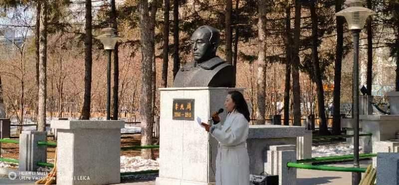 与会人员为李兆麟将军扫墓后,纪念大会正式开始。纪念大会由黑龙江省十佳讲解员、金牌主持、中苏友好协会旧址纪念馆讲解员施展主持。他详细讲解了李兆麟将军的生平,讲解了李兆麟将军创作的《露营之歌》,介绍了李兆麟联合各界民族人士成立的中苏友好协会。