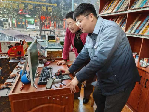 图为:洛阳市烟草公司嵩县分公司工作人员给孙宽霞指导使用云POS系统
