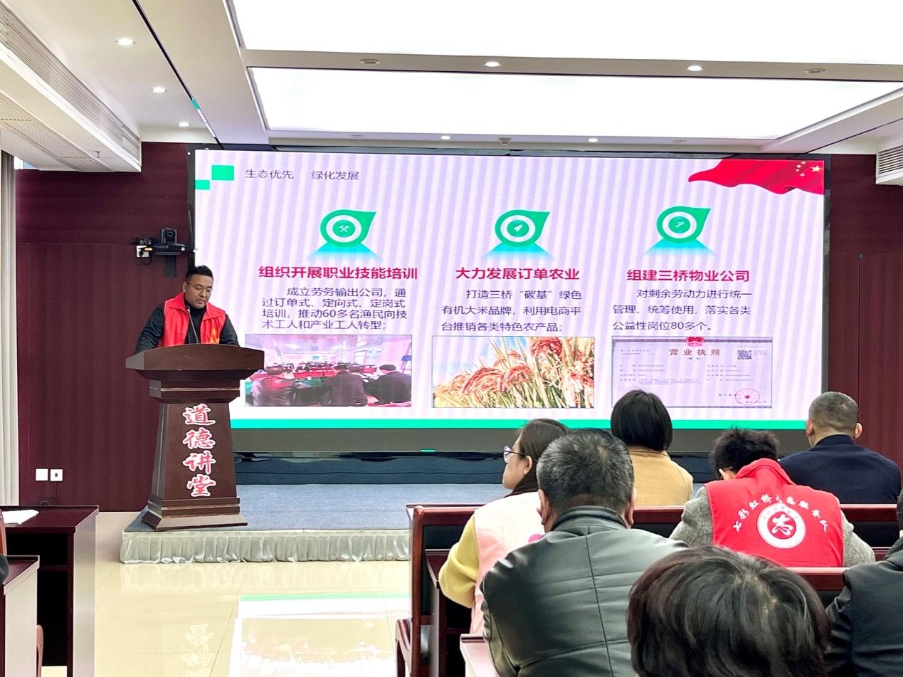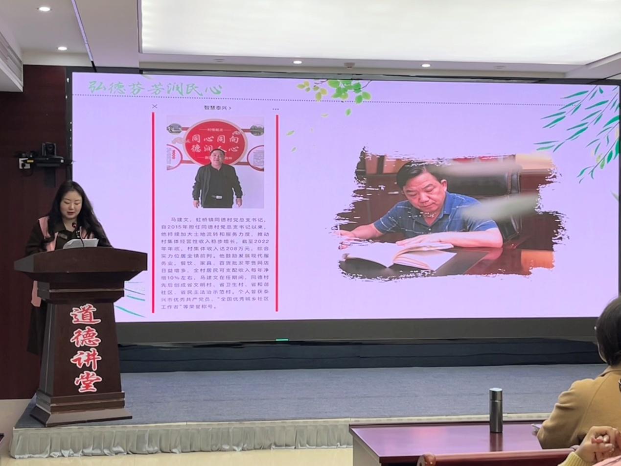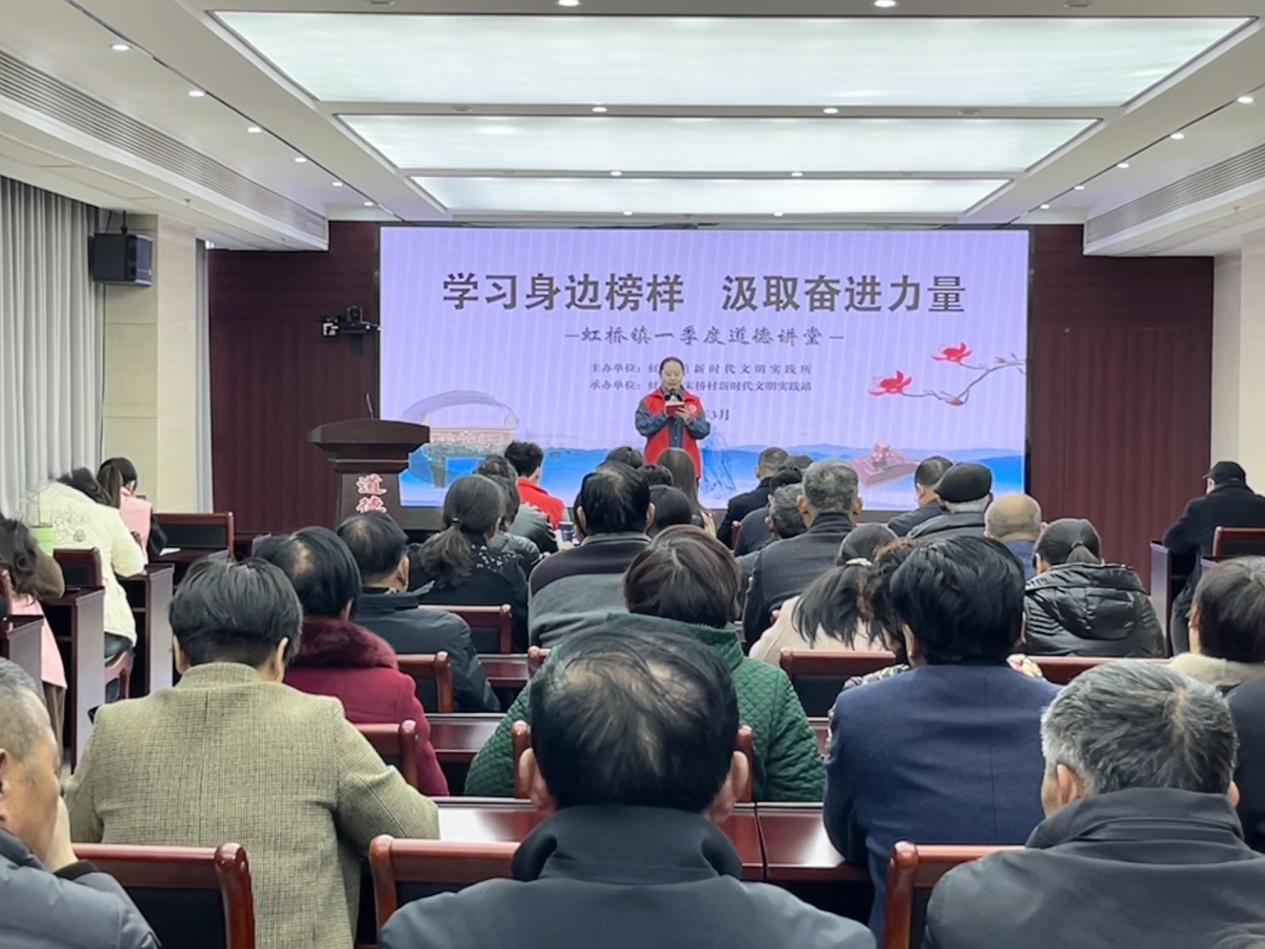 3月20日上午,虹桥镇以“学习身边榜样 汲取奋进力量”为主题的一季度道德讲堂开讲。本次道德讲堂活动由虹桥镇新时代文明实践所主办、宋桥村新时代文明实践站承办,虹桥镇先进典型代表、文明家庭代表、村居干部、群众代表100多人参加活动。