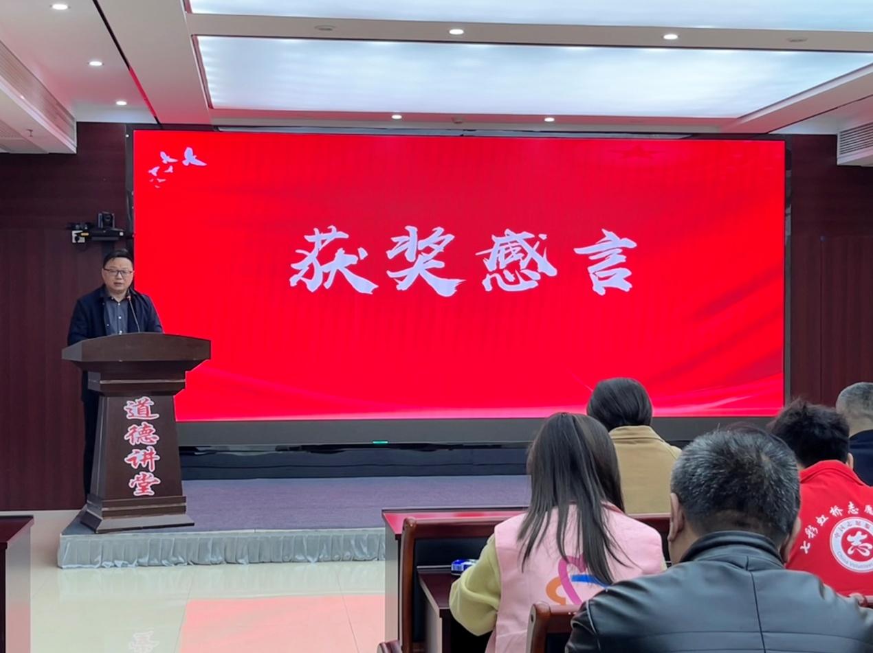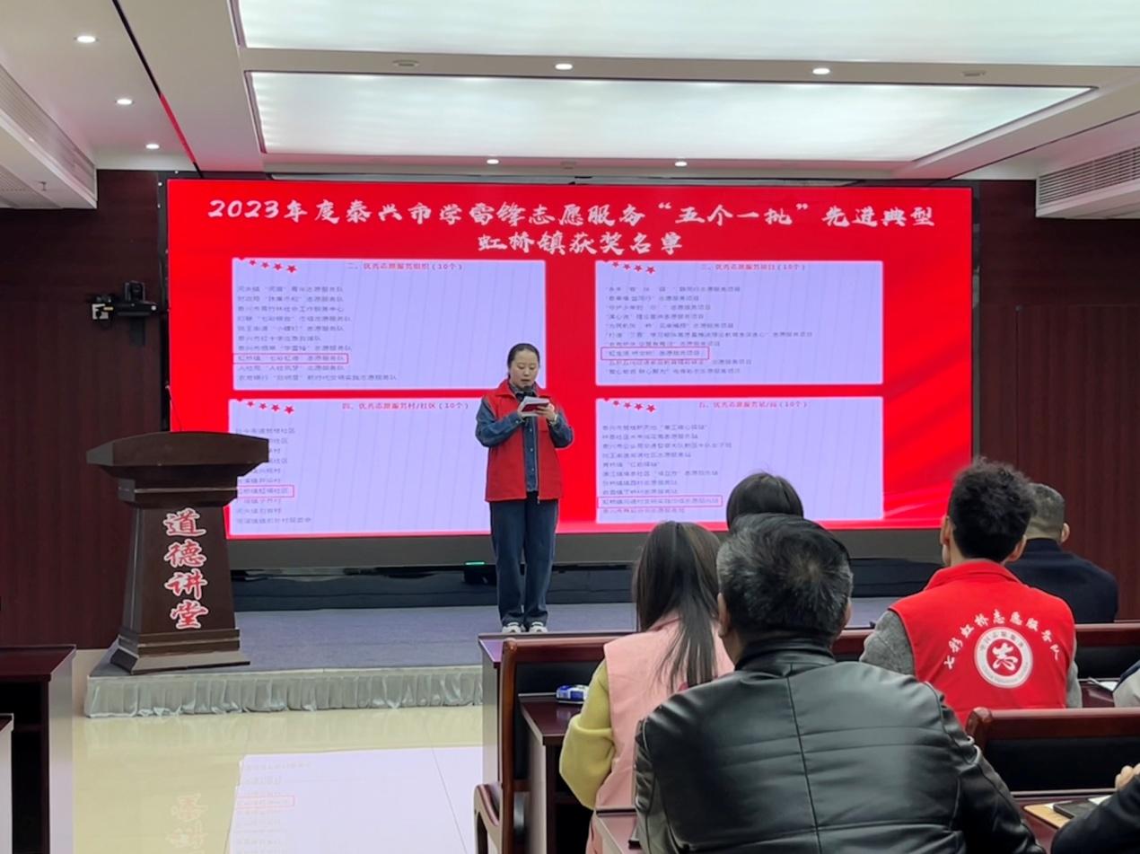 表彰2023年度泰兴市学雷锋志愿服务“五个一批”先进典型虹桥镇获奖名单,“七彩虹德”志愿服务队队长、虹德社区党总支书记徐宏斌作为代表发表感言。