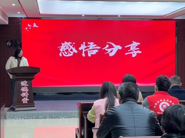 道德讲堂分为六个环节:讲一次事迹、谈一份感悟、作一次表彰、讲一段理论、看一段视频、送一份吉祥,活动过程中穿插有奖问答环节。