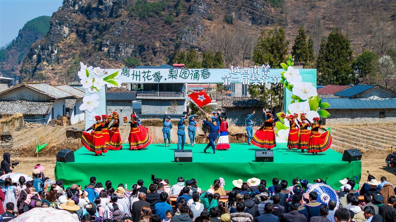 三月梨花雪,相约“趣”嶲州。近日,第二届越西县“嶲州花事·梨园诵春”梨花节系列活动在南箐镇南山村举办。接地气的文艺演出、梨花仙子比赛、古道骑马体验、民族文化体验以及斗羊、斗鸡、摔跤等激烈的民俗竞技比赛,吸引了来自成都、西昌、上海等地的众多游客前来游玩,静谧的南山村热闹非凡。