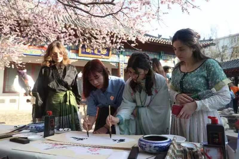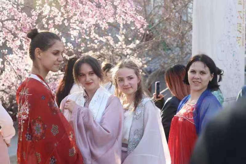 阳春三月,万枝丹彩。第33届天津运河桃花文化商贸旅游节吸引了众多市内外游客前来打卡。日前,天津外国语大学的近百名留学生应邀走进桃花节,他们身着汉服,在西沽公园看非遗、品美食,在桃花堤赏美景、写书法,感受中华优秀传统文化的独特魅力。