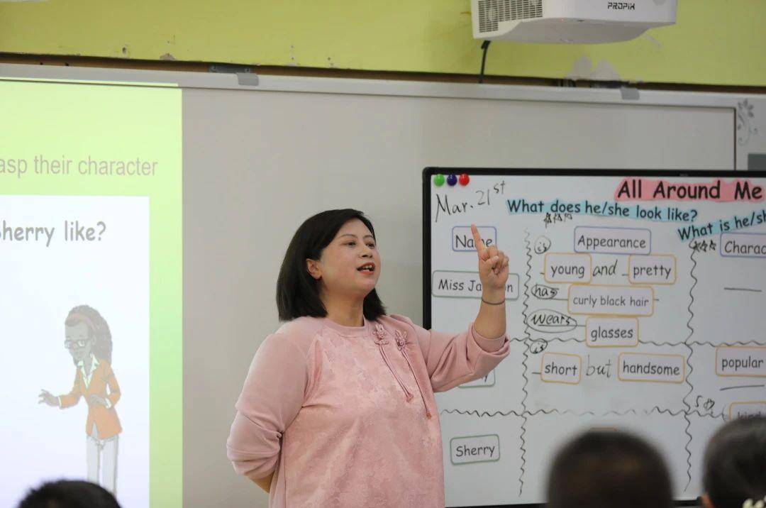 活动中,锦江区信息化名师工作室领衔人谢丹老师执教《Unit2 All Around Me》课例。课堂聚焦Bill初到加拿大小学的所见、所知、所感,抓住介绍人物的外貌,性格和喜好三个重点方面,即渗透“Like”的不同用法,将之融入整堂课中,让学生感受,并将学生们在一到五年级学习过的话题词汇和表达综合呈现。