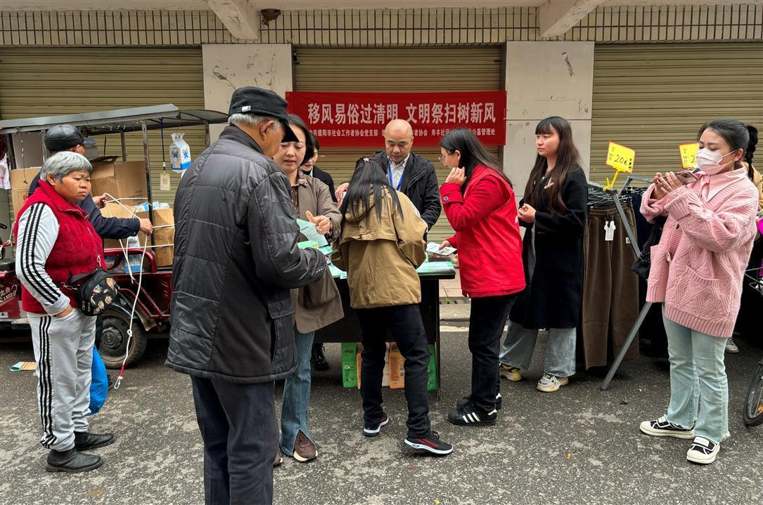 此外,在黄许场镇及寿丰场镇两地,工作人员摆放知识展板、发放宣传资料,让前来参加活动的居民了解鲜花祭祀、网络祭祀等文明、环保的祭祀方式,增强民众对清明节的文化认同感。