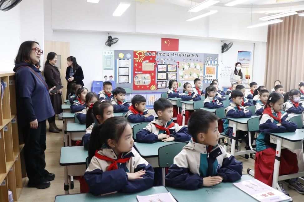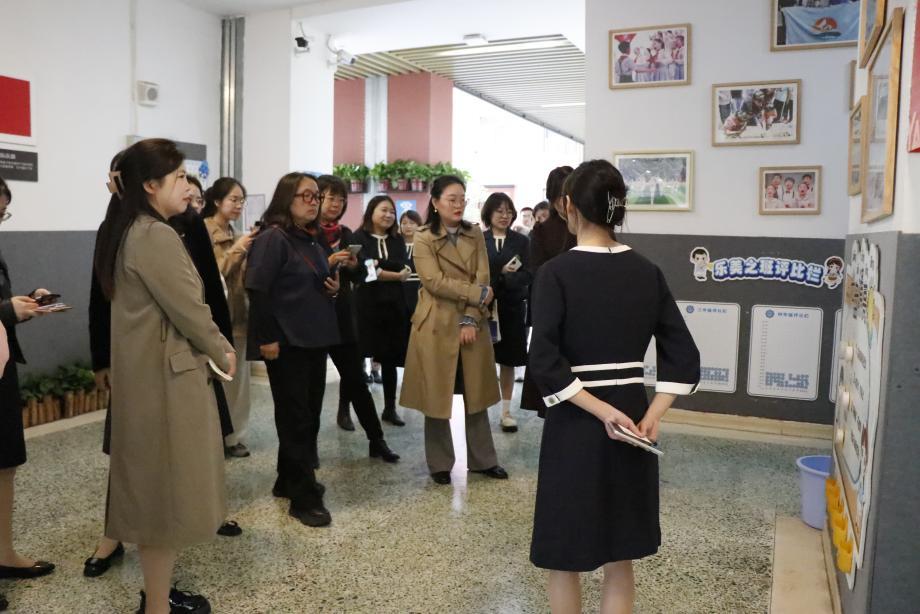 随后,专家组走进二年级教室,参观班级建设、文化氛围等,观察学生课间活动组织、师生互动、生生互动等情况,了解到学校的环境建设坚持儿童本位,推动幼小科学衔接。