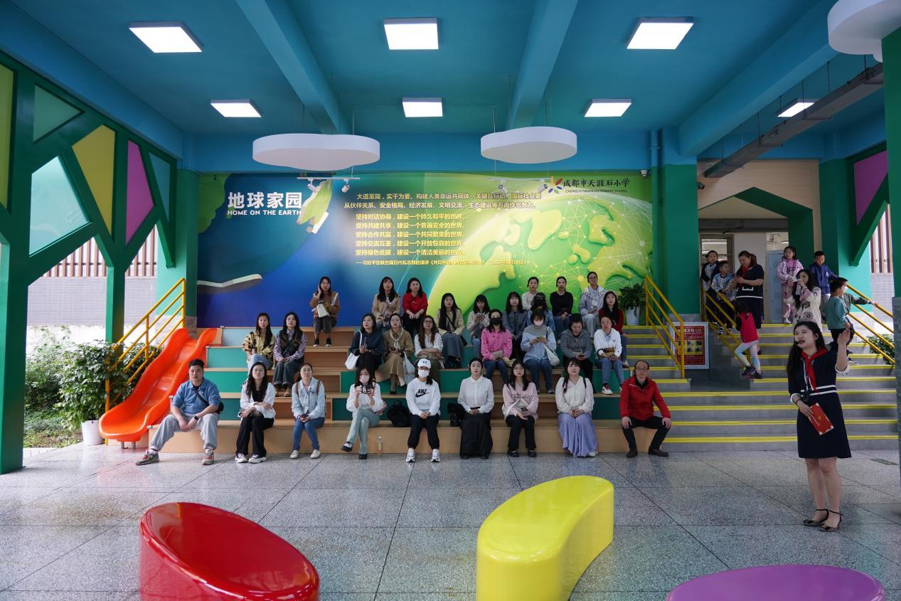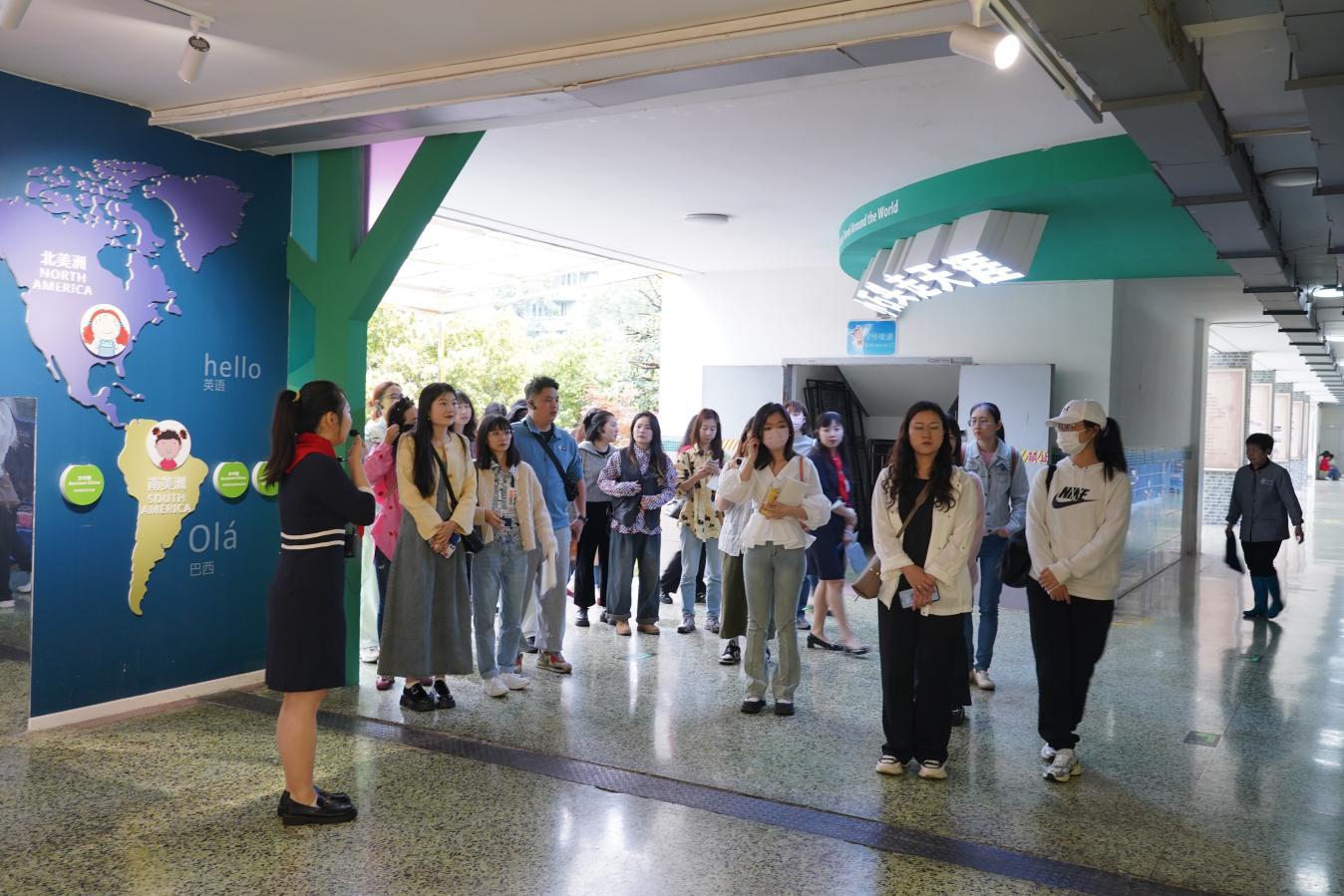 校园长廊内,工作室成员青依敏、聂宇轩、周丫琳老师带领与会辅导员参观“小石头走天涯”空间馆和“地球家园”体验空间,沉浸式体验“一廊”“一驿”“一面”和多变、开放的地球家园功能区。