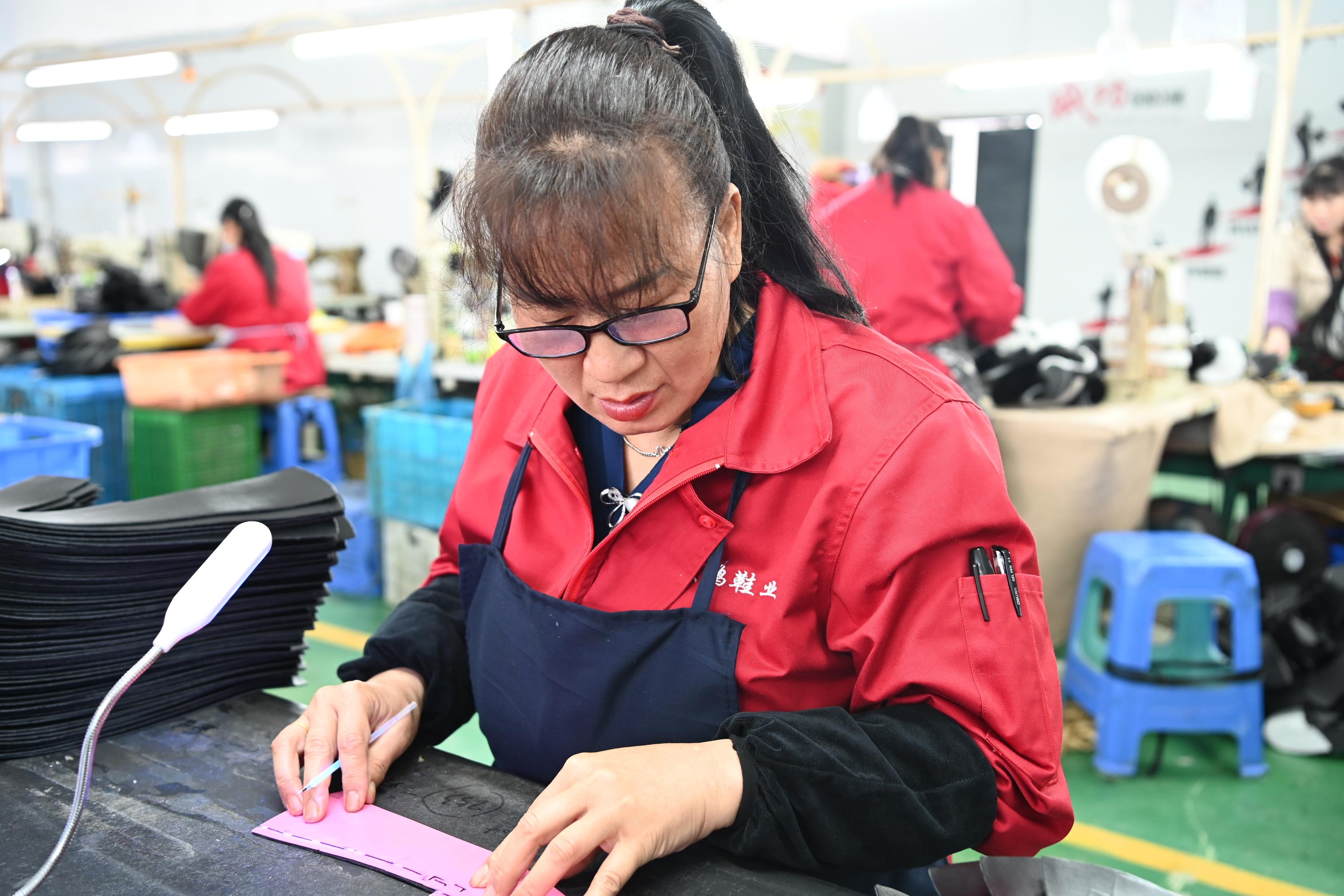 杨淑芳的忙碌镜头,就是“俊鸿”二楼生产车间100多名工人忙碌的缩影。二楼的繁忙,倒逼着一楼下料车间和三楼成品车间的进度。一楼,一卷一卷的皮料,在师傅们按动的电钮开关操作下,一双双皮鞋面料按照设计图样裁剪而成;三楼成品车间、产品质检关口、包装车间也是忙碌得不亦乐乎,虽然气温陡降,但工人却干得额头冒汗。