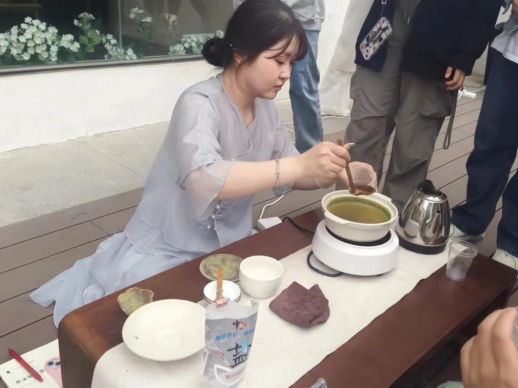 为了让师生更直观地感受茶文化的魅力,活动现场设置了丰富多样的互动环节。参与者们亲自体验了泡茶的过程,品尝了不同种类的甘醇茶汤,感受其中的独特韵味。仿唐煎茶和仿宋点茶展示吸引大量茶文化爱好者的关注。同学们通过现代器具还原了唐朝的煎茶步骤,体验加盐调味的烹茶方式和点茶过程,对唐宋茶文化有了更加直观地认识,感受到了极具魅力的中国茶道。