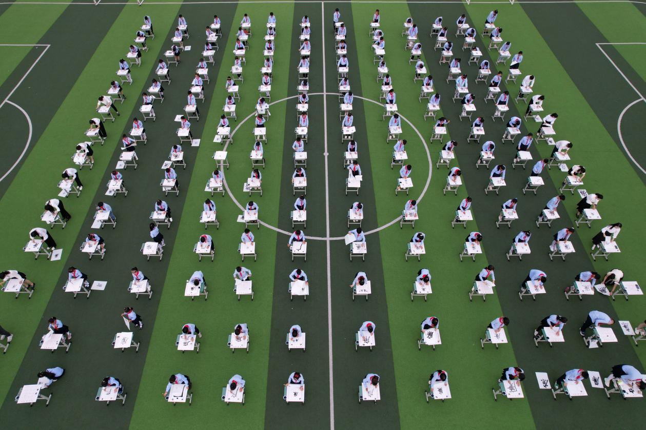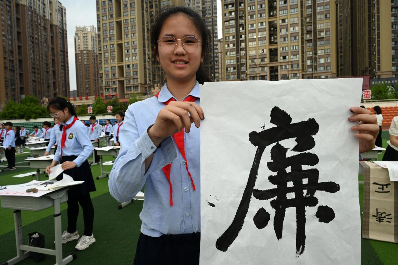 4月17日,在内江市东兴区五星小学校,学生正在参加百人书廉活动。