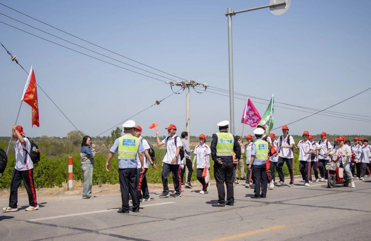 倾情鼓励,保驾护航。班旗迎风招展,一路上师生们互相鼓励,口号响亮,士气高涨。校领导和老师全程陪伴,为同学们筑起安全的防线,引领他们顺利抵达远足终点。交警同志身姿挺拔,尽心尽责为学子们开辟出一条安全畅通的道路,确保远足队伍能够平安前行。医务人员则紧随其后,他们随时准备应对突发状况,为师生们的生命安全保驾护航。