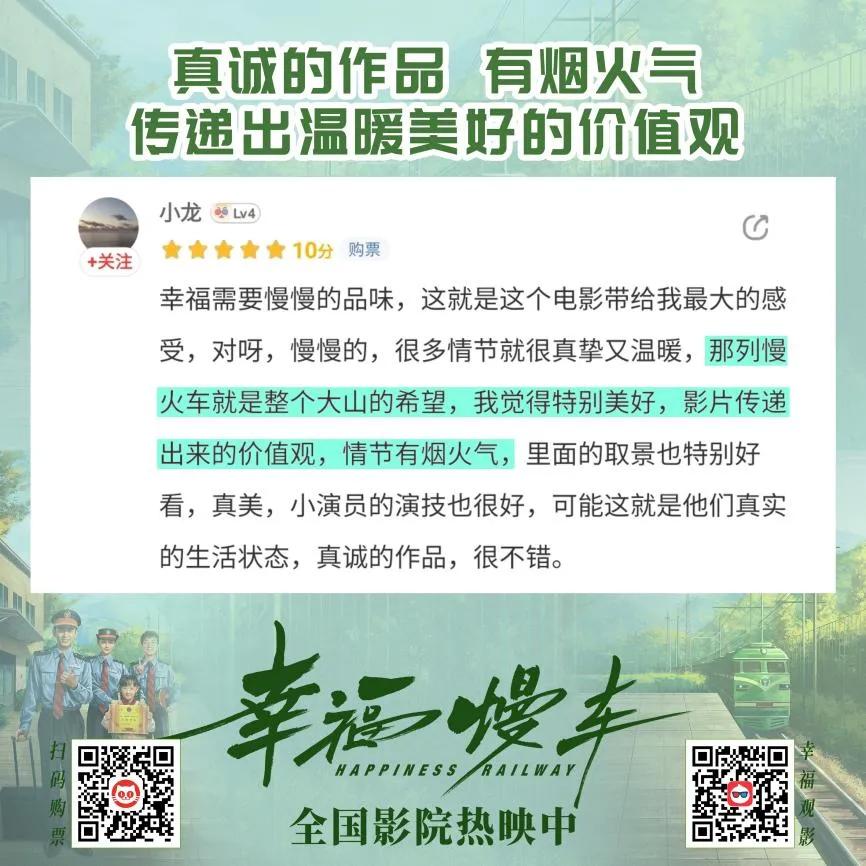 作为国内首部公益慢火车题材电影,影片上映后得到了各界专家与媒体的肯定,以及观众的大力支持——这是一部有温度、有感情、充满人文主义与现实关怀的佳作。